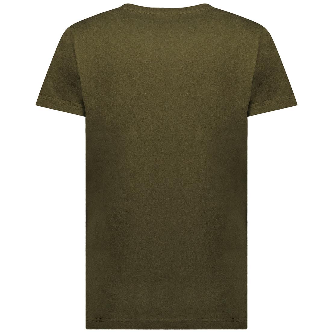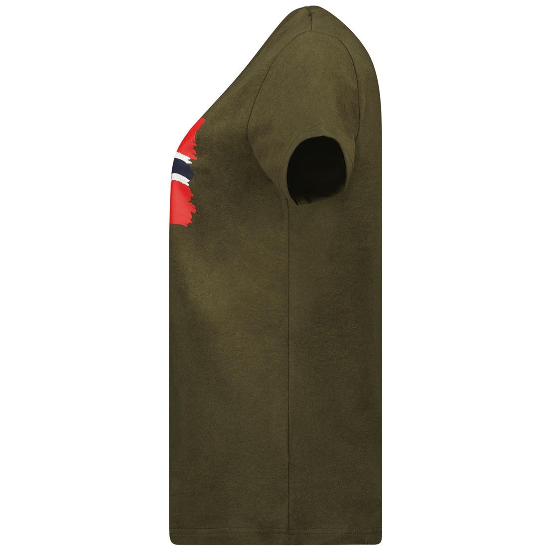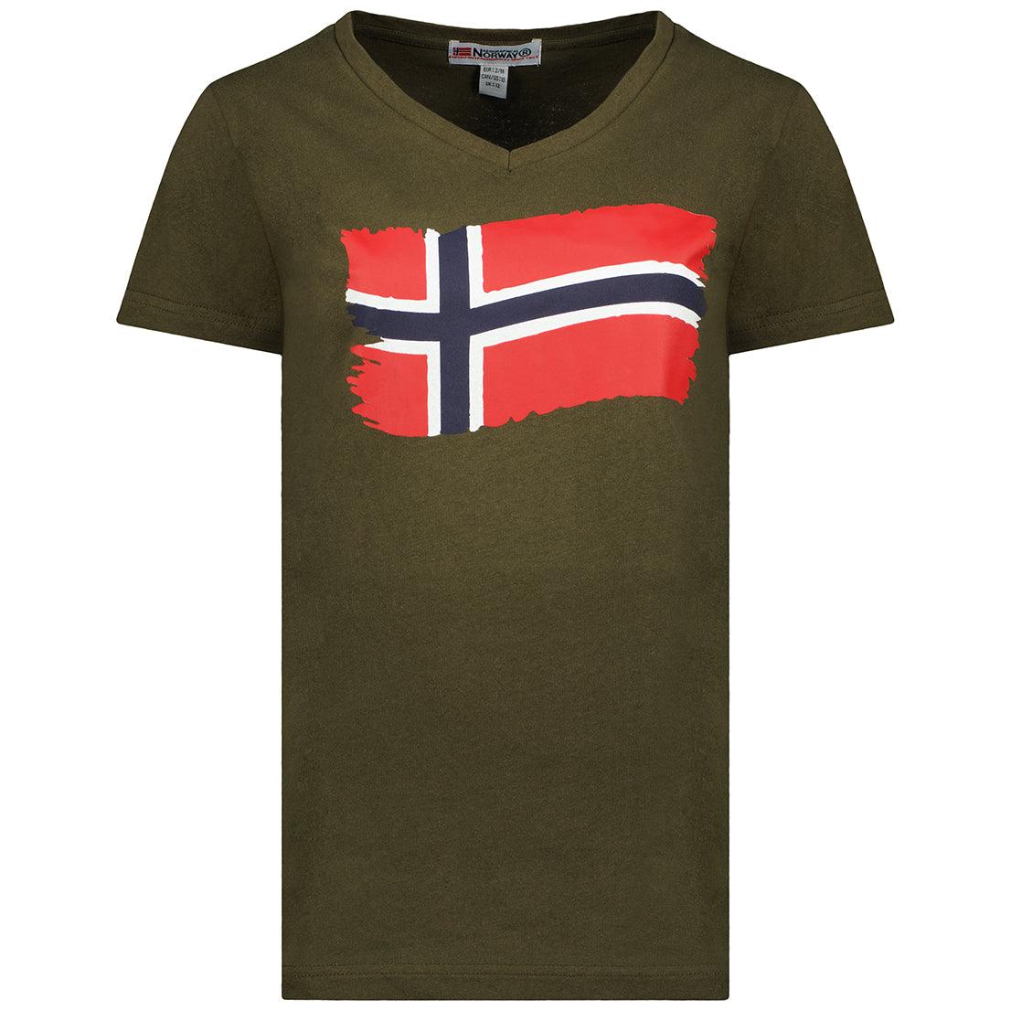 Camiseta de mujer de manga corta de GEOGRAPHICAL NORWAY de cuello de pico. Este modelo presenta una bandera noruega, símbolo de la marca GEOGRAPHICAL NORWAY, en la zona del pecho.