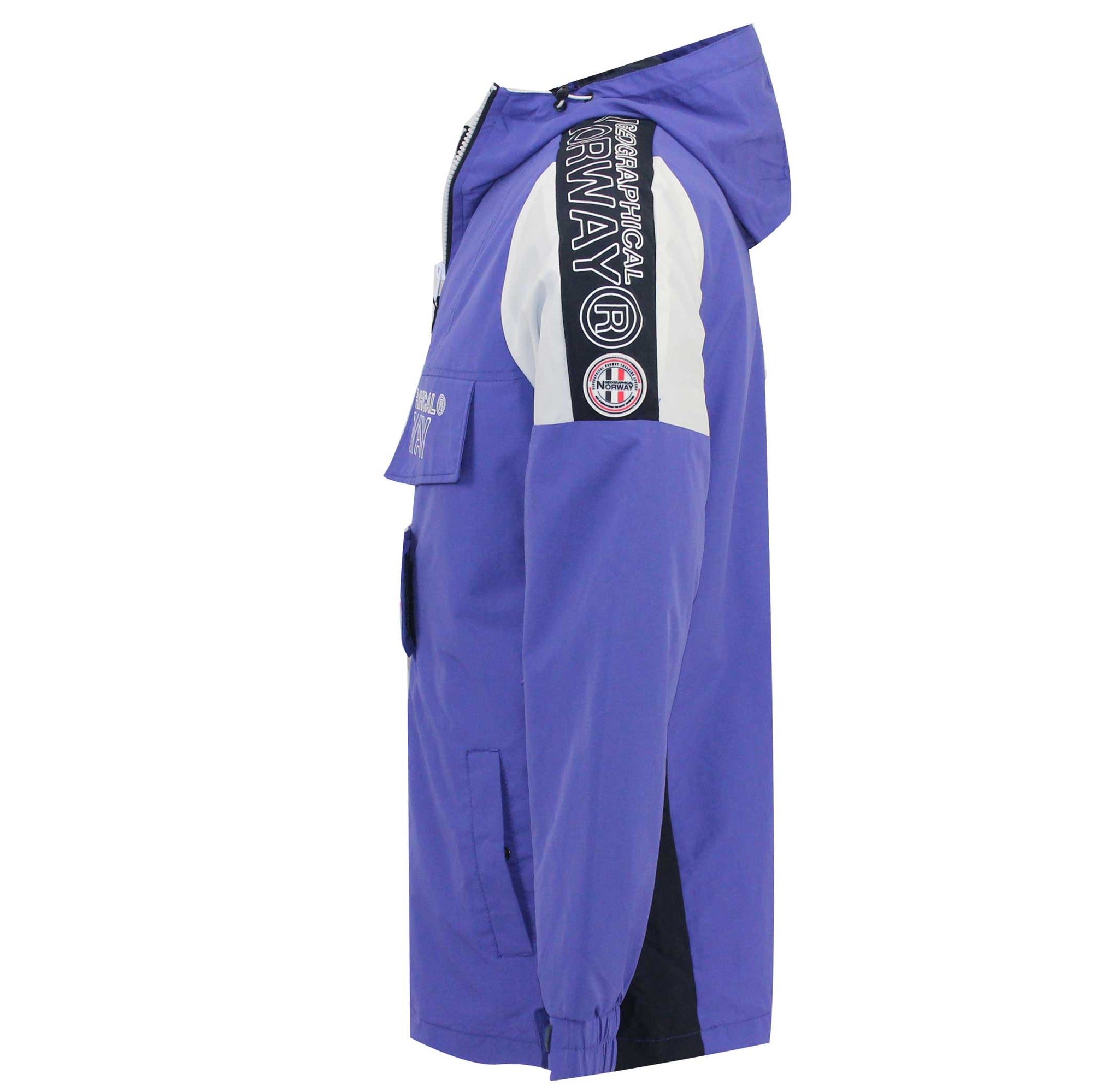 Chaqueta de niño GEOGRAPHICAL NORWAY de color azul eléctrico de apertura en media cremallera. Este modelo, que es impermeable y cortavientos, dispone de una capucha fija y puños ajustables, para lograr la máxima sujeción. Es un modelo perfecto para el verano.