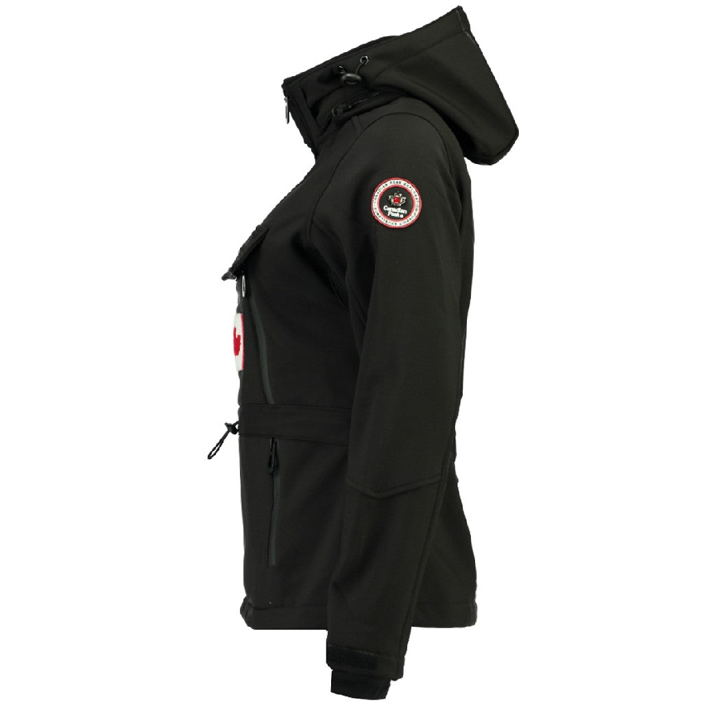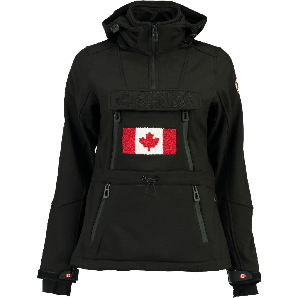 Chaqueta softshell de niña con capucha y media cremallera. En la parte frontal lleva un bolsillo ajustable con solapa de velcro y bordados de la marca, además de dos bolsillos. Los puños son ajustables, también tiene un cordón ajustable en la cintura y u