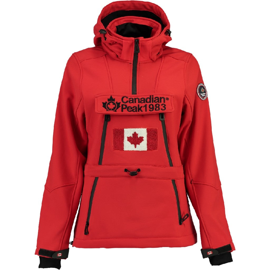 Chaqueta softshell de niña con capucha y media cremallera. En la parte frontal lleva un bolsillo ajustable con solapa de velcro y bordados de la marca, además de dos bolsillos. Los puños son ajustables, también tiene un cordón ajustable en la cintura y u